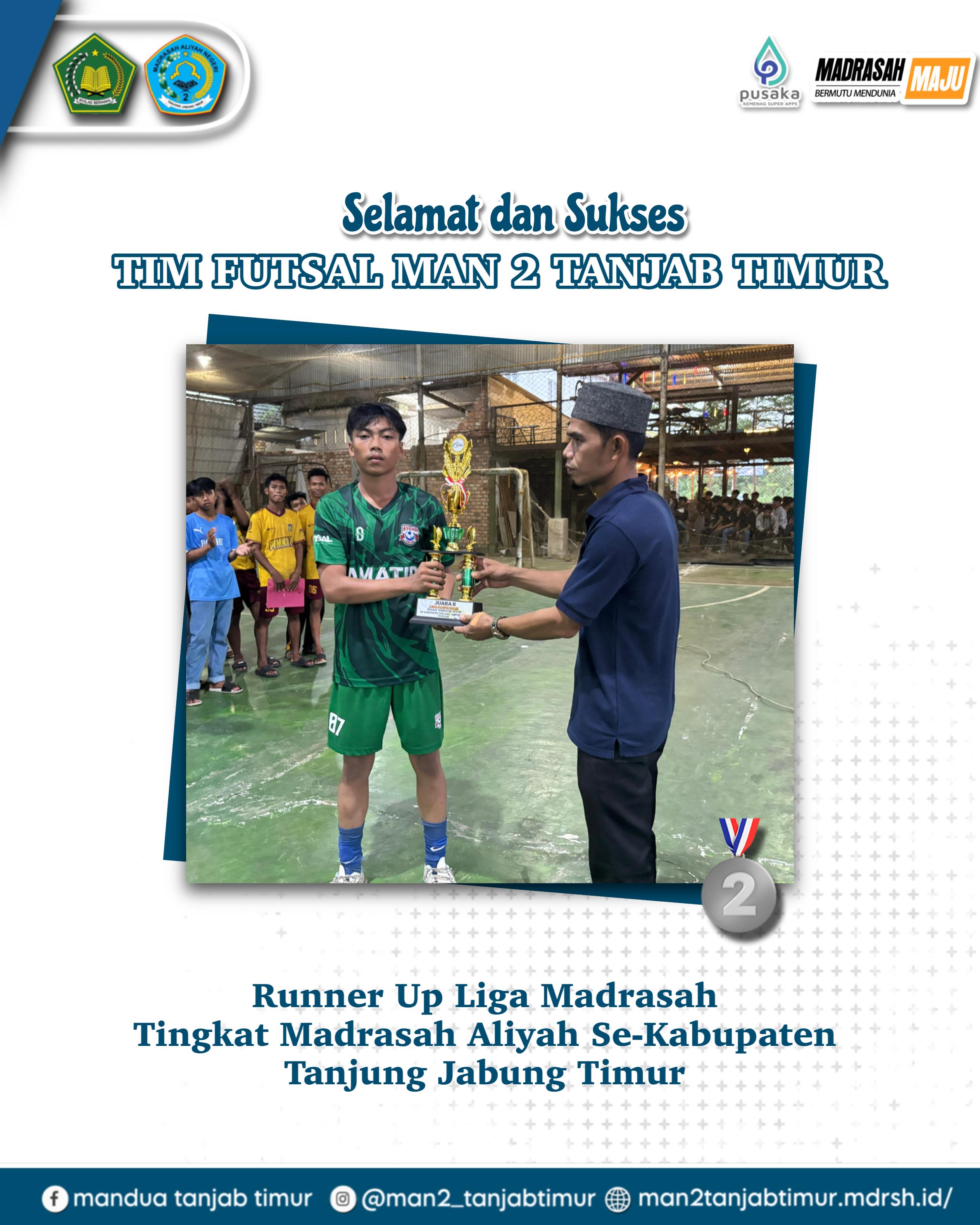 Nipah Panjang ( MAN 2 Tanjabtim)_ Tim Footsal MAN 2 Tanjabtim ( MANDA FC), berhasil meraih juara dua (runner up) dalam dalam Laga Liga Madrasah 2024, yang diselenggarakan di Muara Sabak pada Minggu, 8 September 2024.