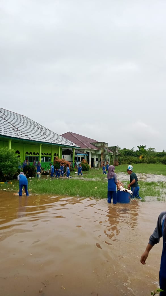 Tanjung Jabung Timur, [MAN 2 Tanjab Timur] – Dalam kondisi diguyur hujan dan dikepung banjir, semangat guru dan siswa Madrasah Aliyah Negeri (MAN) 2 Tanjung Jabung Timur untuk menjaga kebersihan lingkungan tetap tidak surut. Mereka tetap melaksanakan gotong royong (goro) seperti hari ini, sebuah kegiatan rutin yang diadakan setiap Jumat sebelum proses kegiatan belajar mengajar (KBM) dimulai.