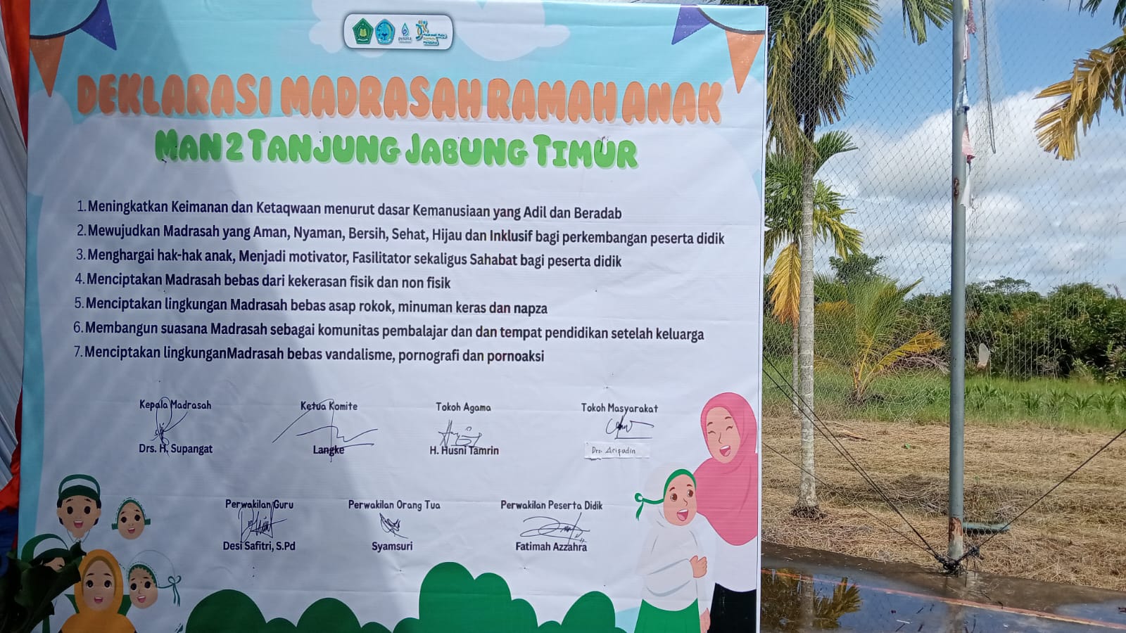 Nipah Panjang (MAN2Tanjabtim)_MAN 2 Tanjung Jabung Timur secara resmi mendeklarasikan diri sebagai Madrasah Ramah Anak dalam sebuah acara yang digelar pada Rabu 23 April 2025 di halaman madrasah. Deklarasi ini merupakan komitmen kuat madrasah dalam menciptakan lingkungan pendidikan yang aman, nyaman, inklusif, dan menghargai hak-hak anak.